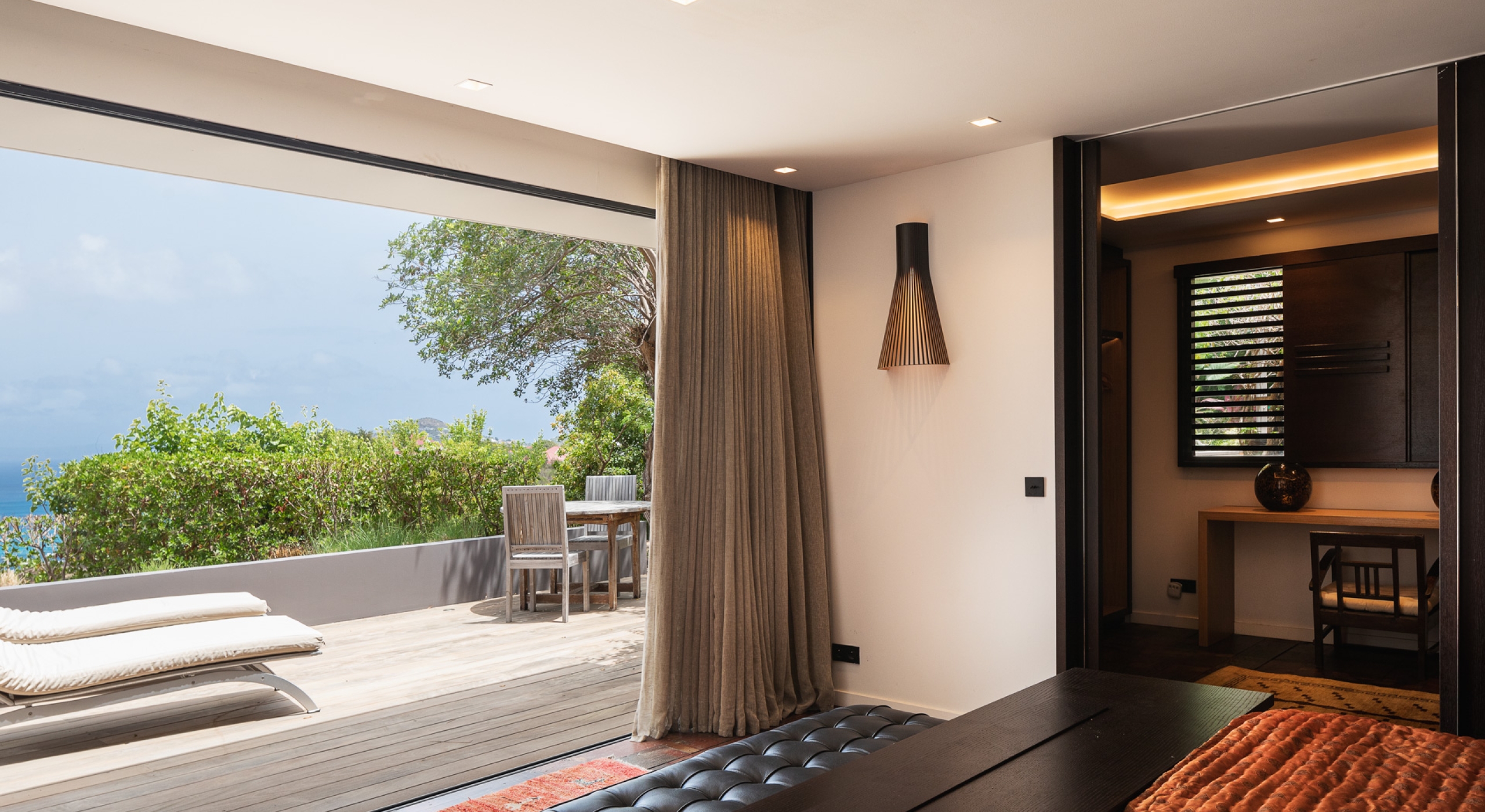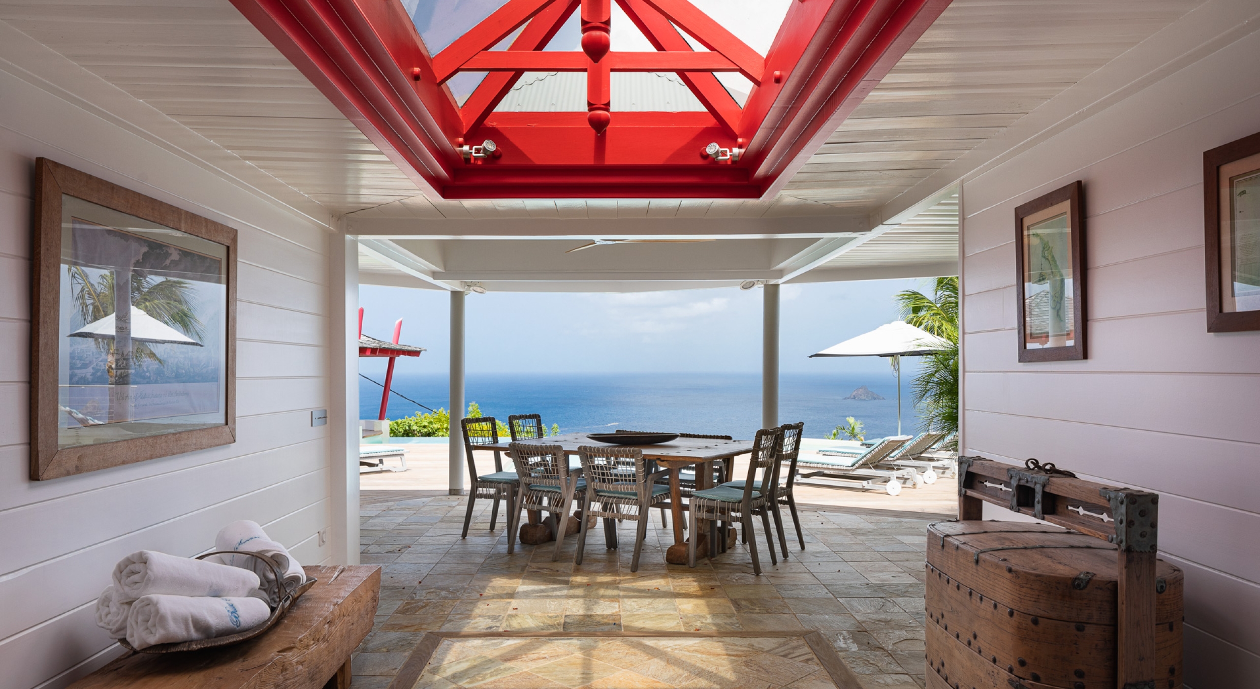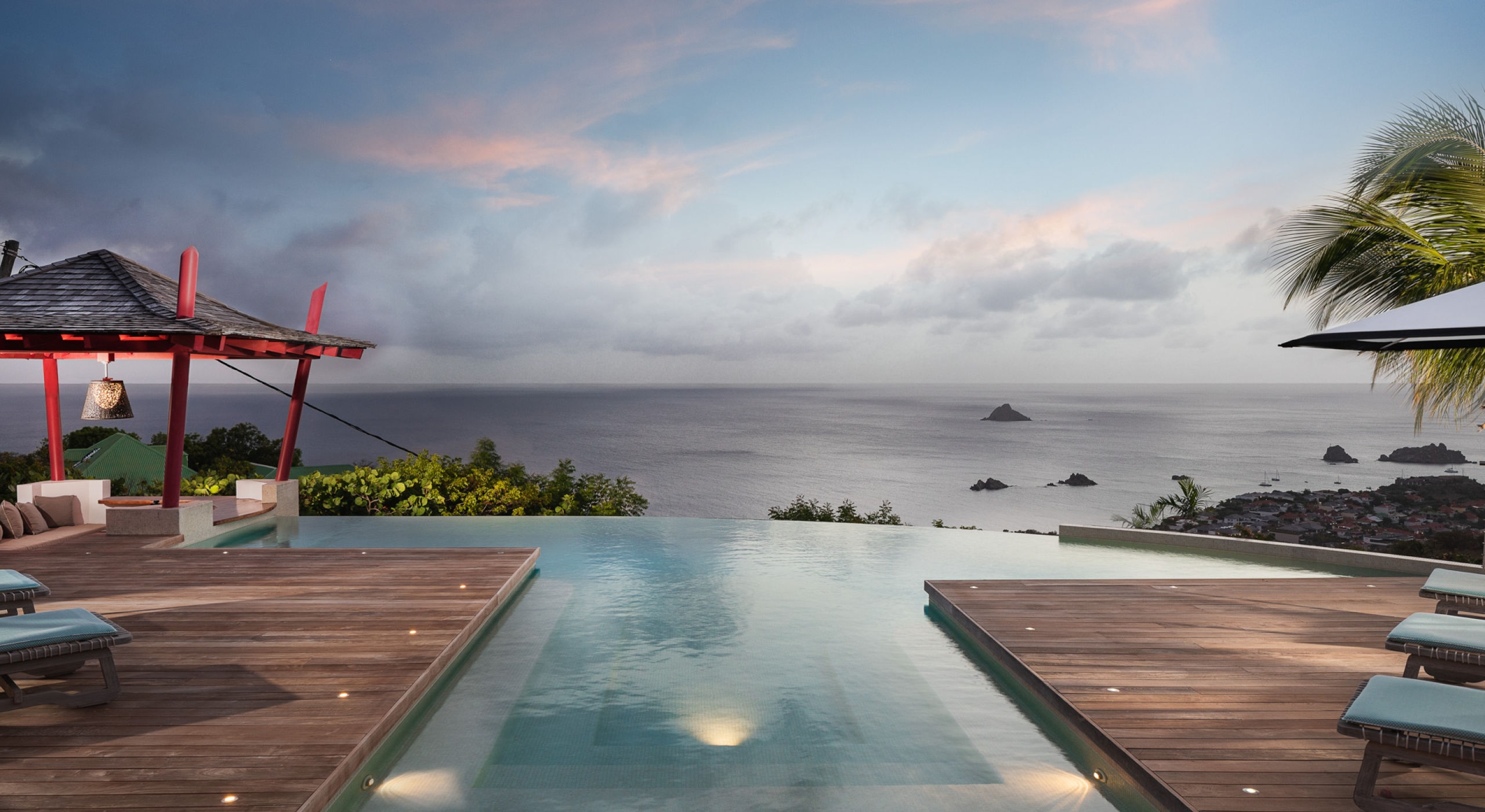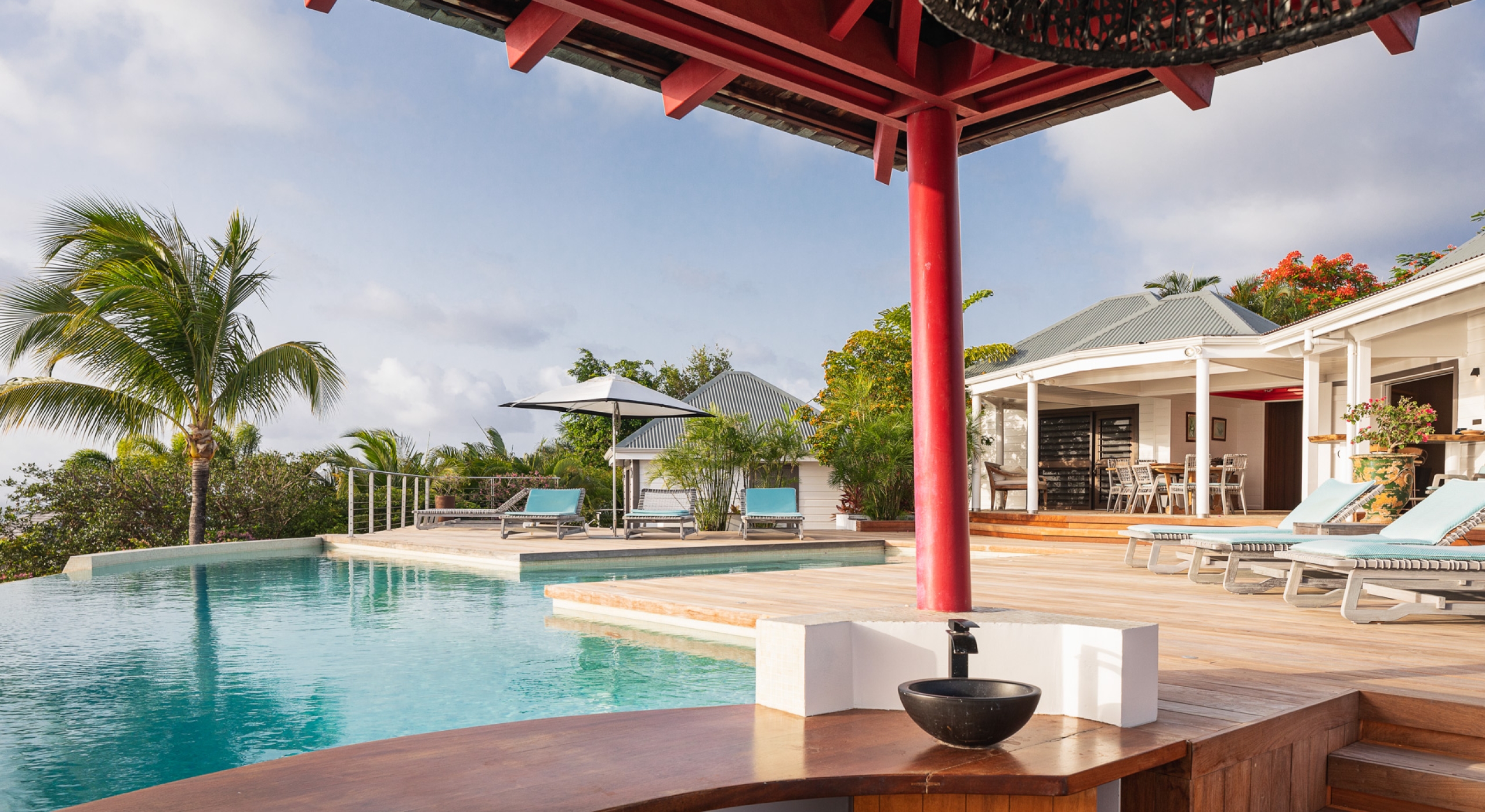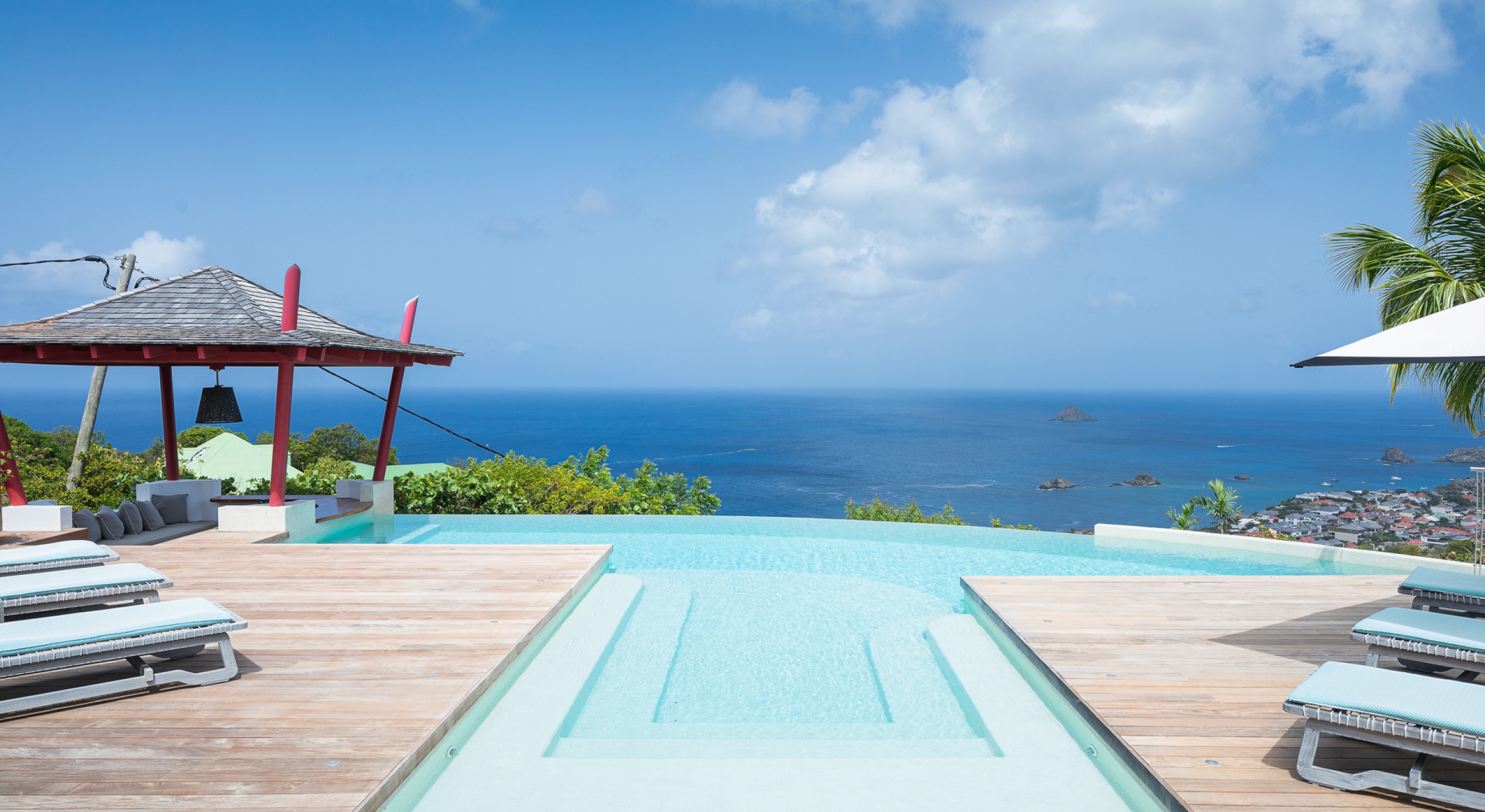 The large living room opens onto the spacious terrace and the beautiful pool overlooking the sea. The Japanese-inspired gazebo with its poolside bar is very popular.