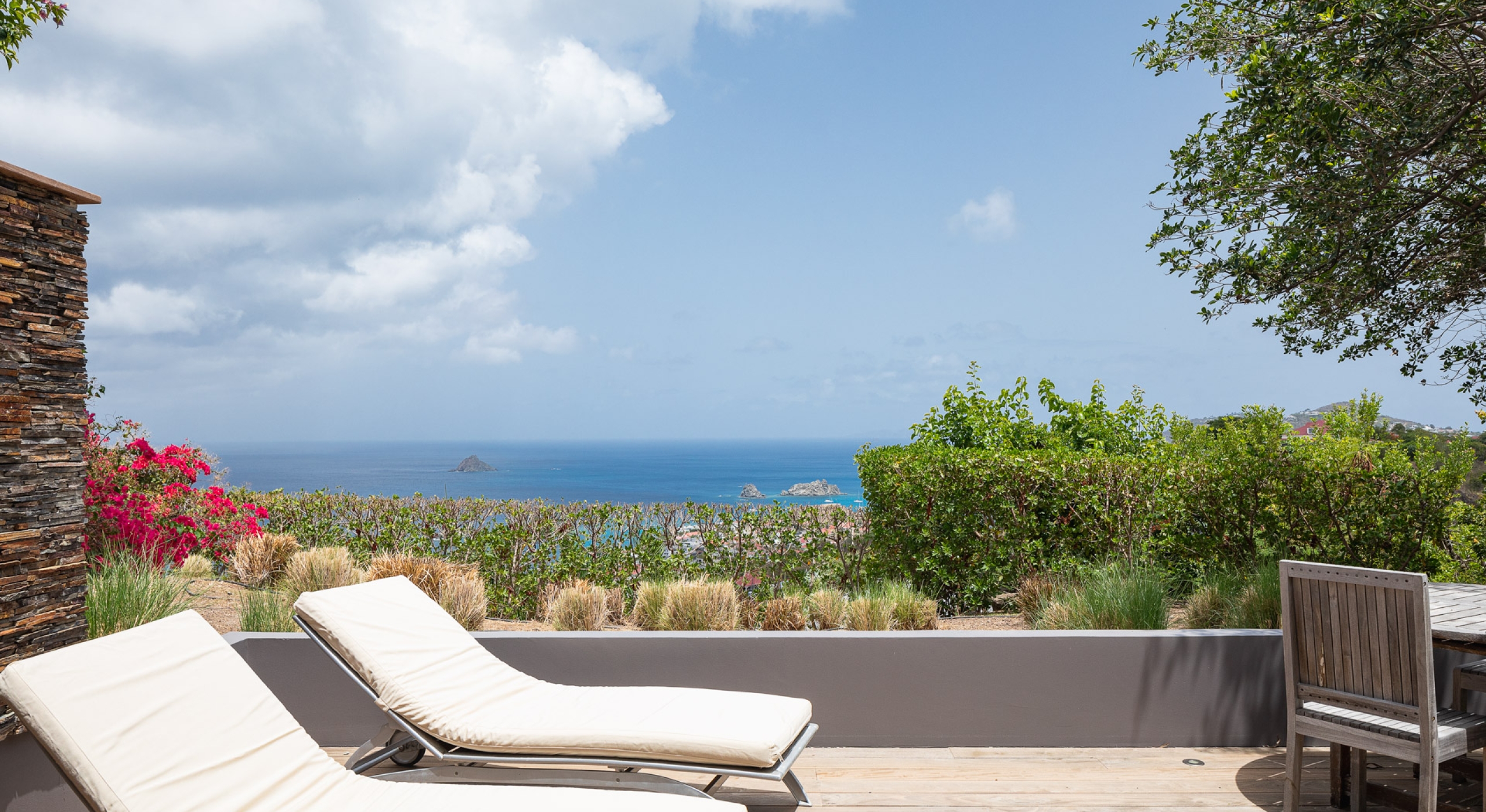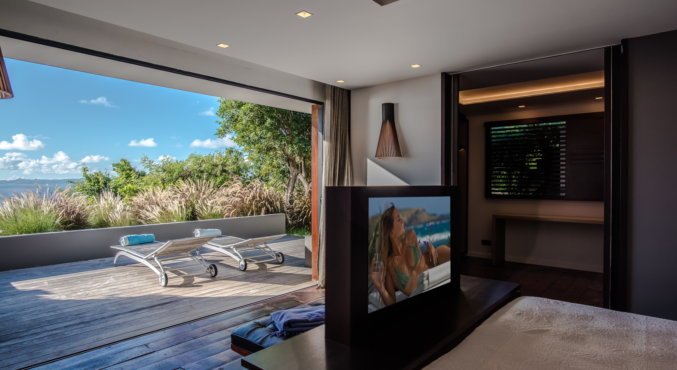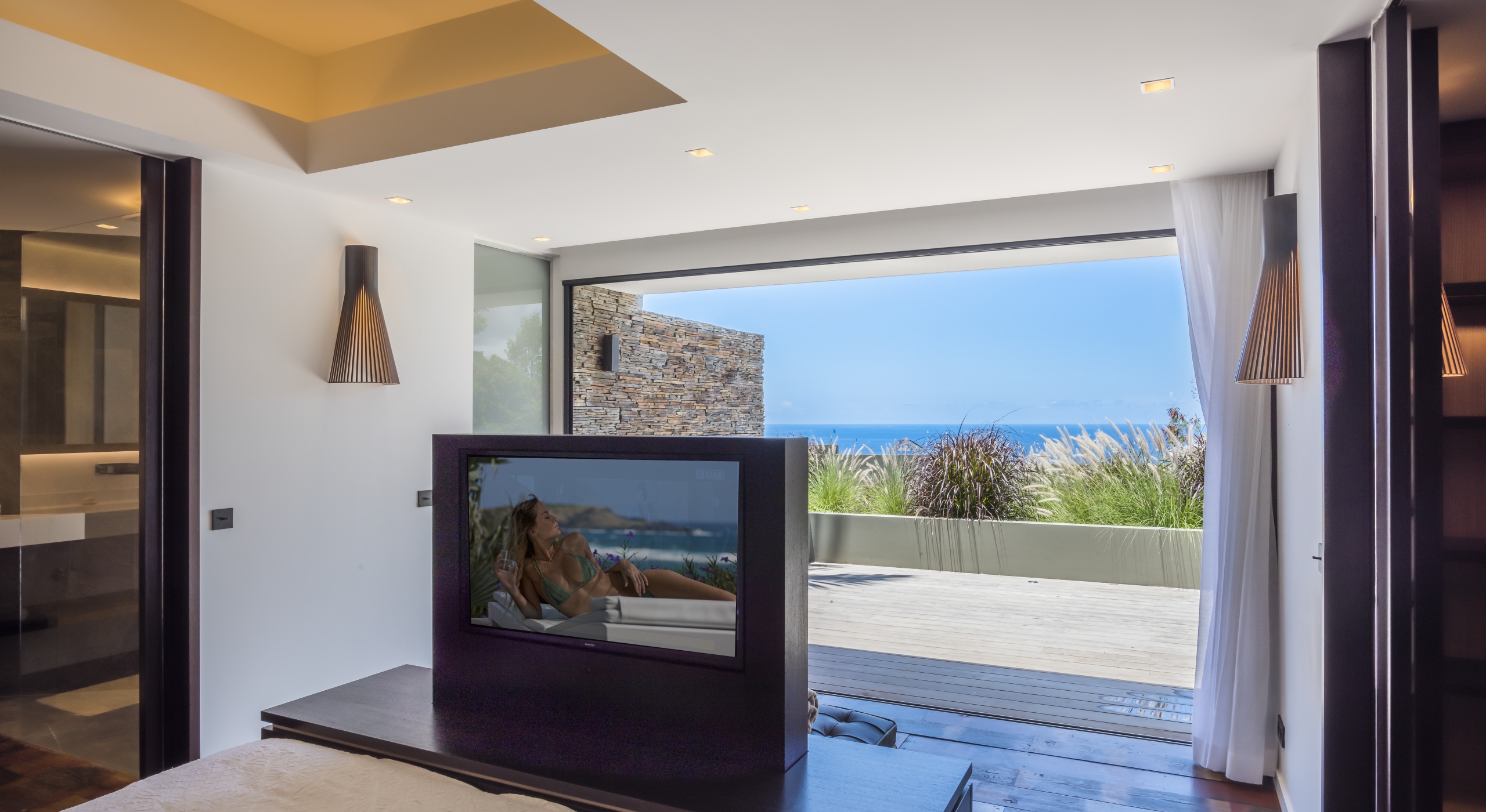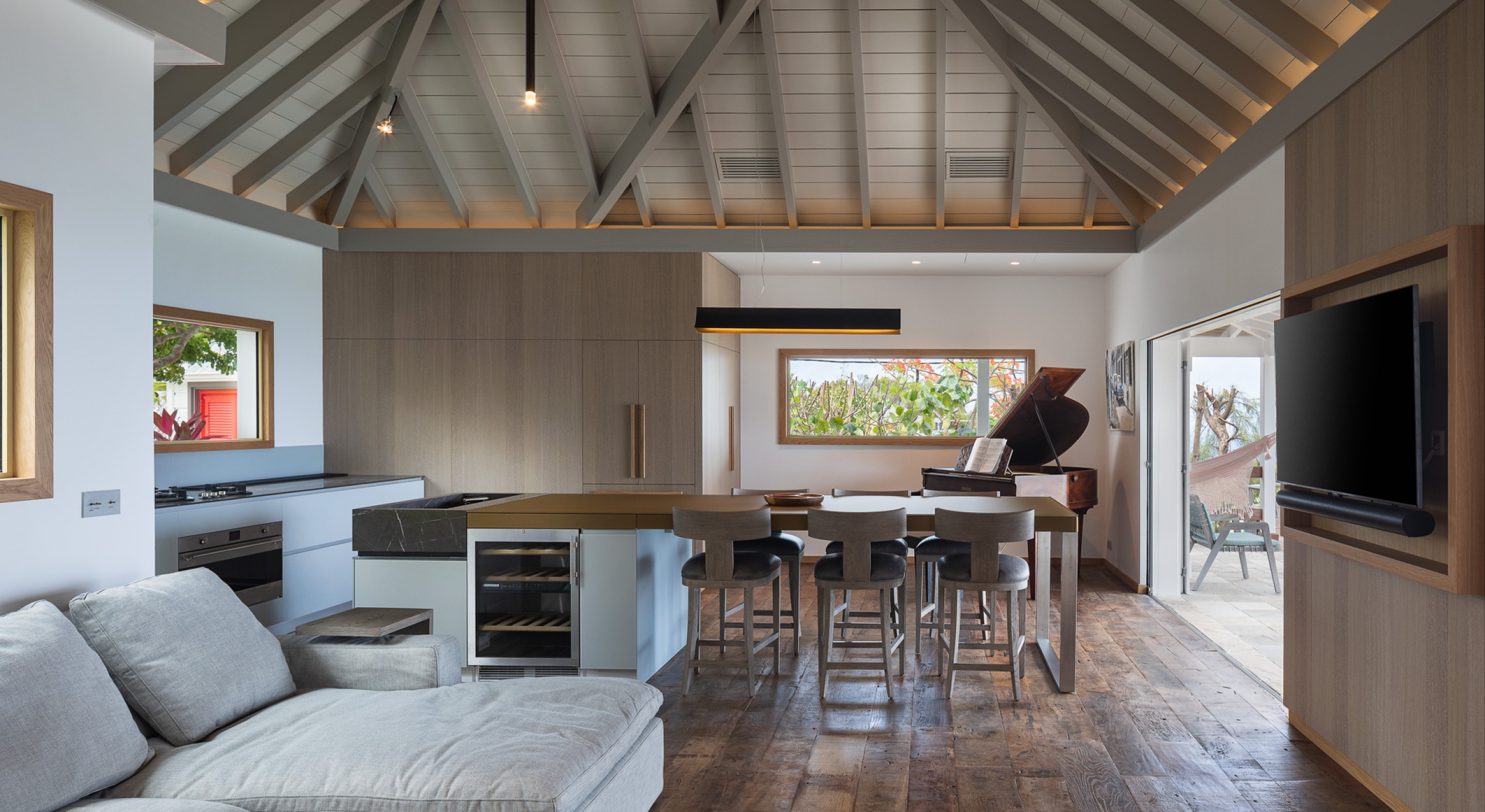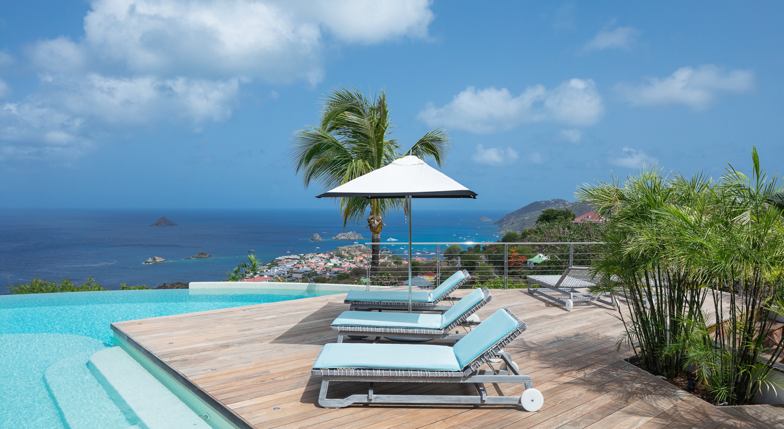 The large living room opens onto the spacious terrace and the beautiful pool overlooking the sea. The Japanese-inspired gazebo with its poolside bar is very popular.